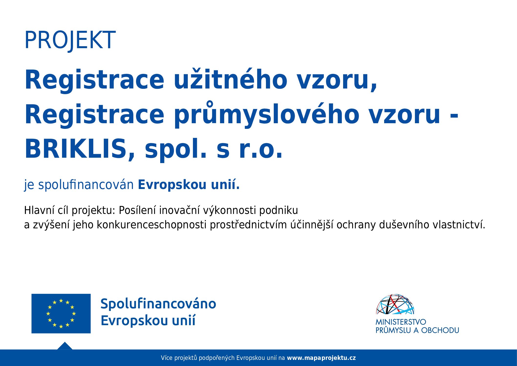 Projekt „Registrace užitného vzoru, Registrace průmyslového vzoru - BRIKLIS, spol. s r.o.“ je spolufinancován Evropskou unií. Předmětem projektu je zajištění ochrany práv průmyslového vlastnictví -…
