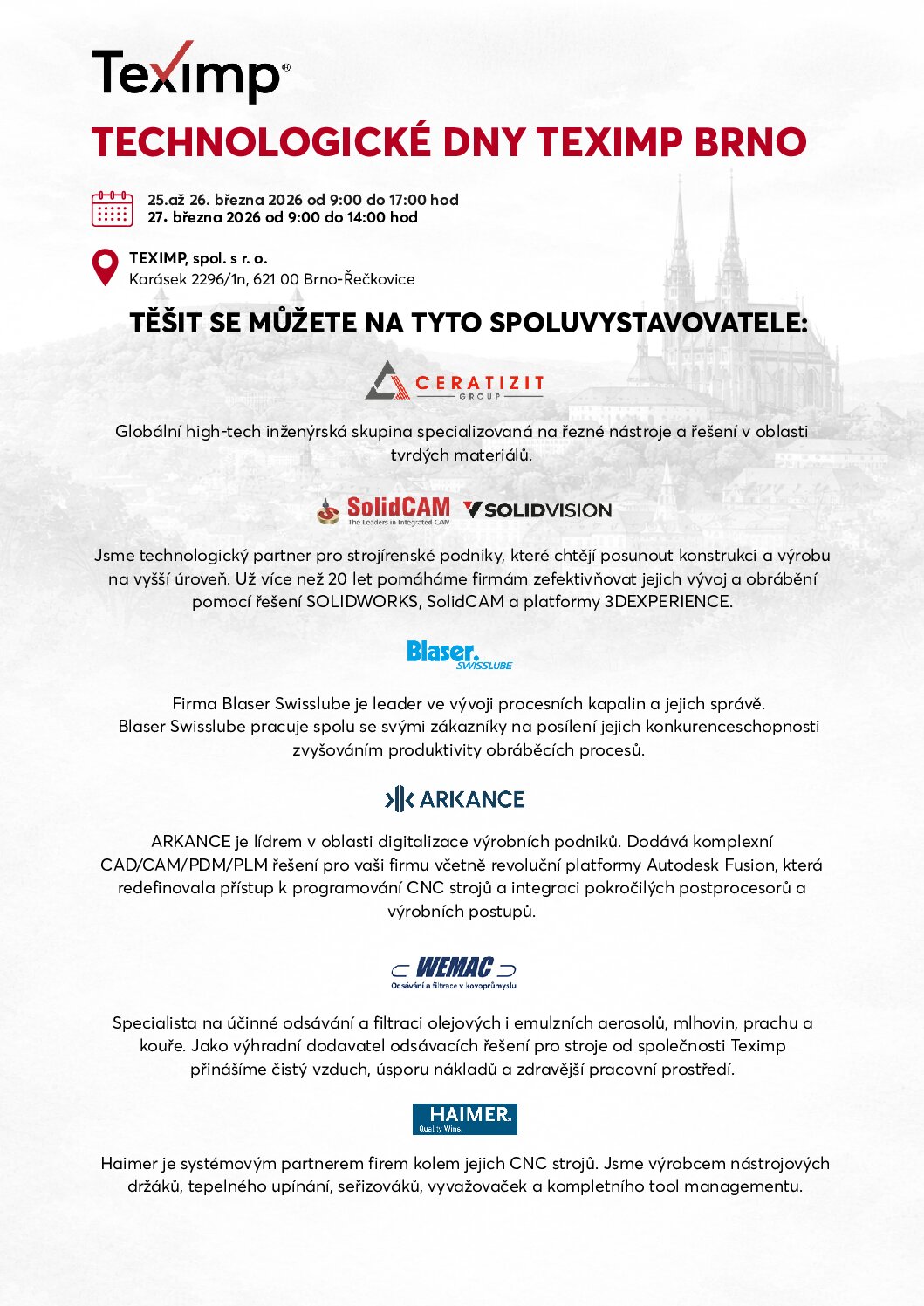 Zveme vás na Technologické dny společnosti TEXIMP, které se uskuteční 25.–27. 3. 2026 v Brně-Řečkovicích. Na této akci zaměřené na nejnovější technologie CNC obrábění se představíme jako spoluvystavovatelé.